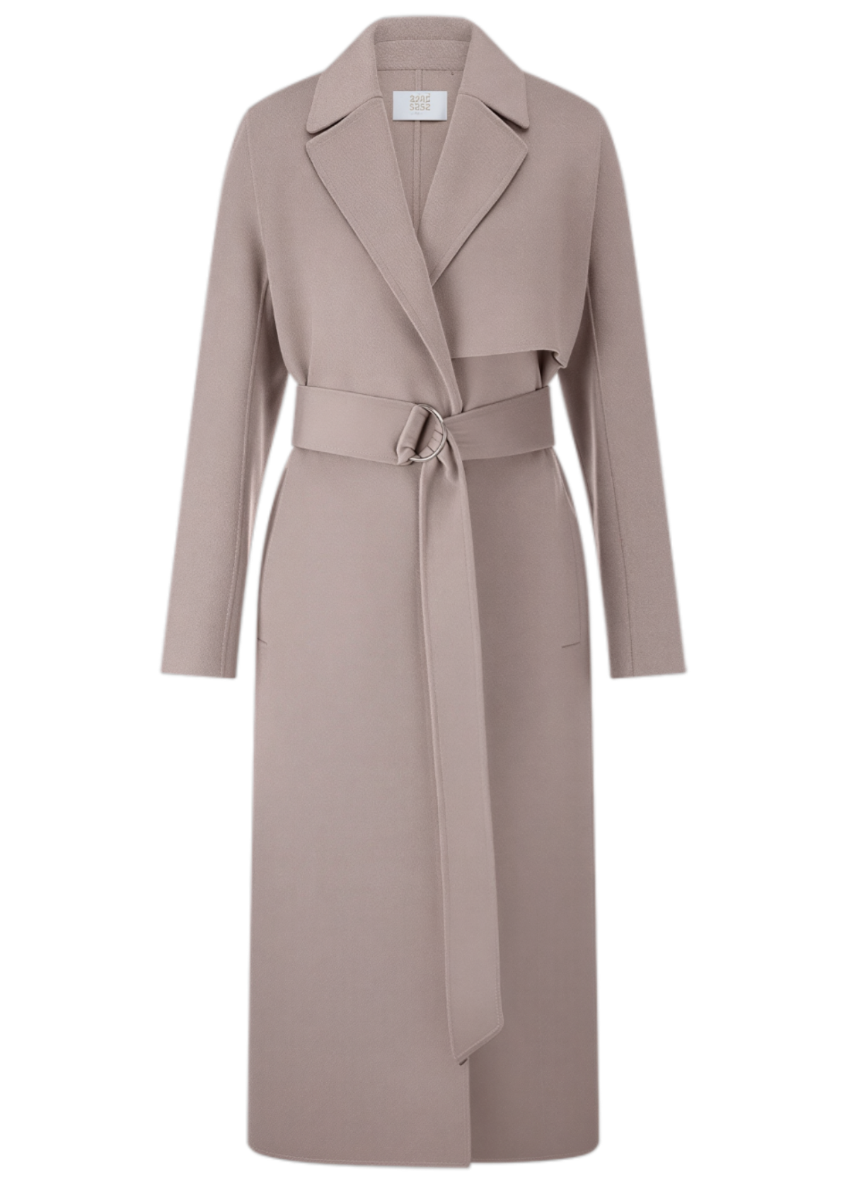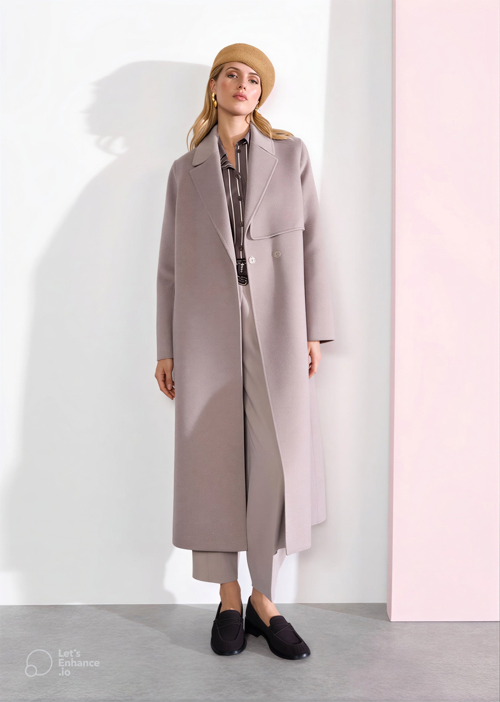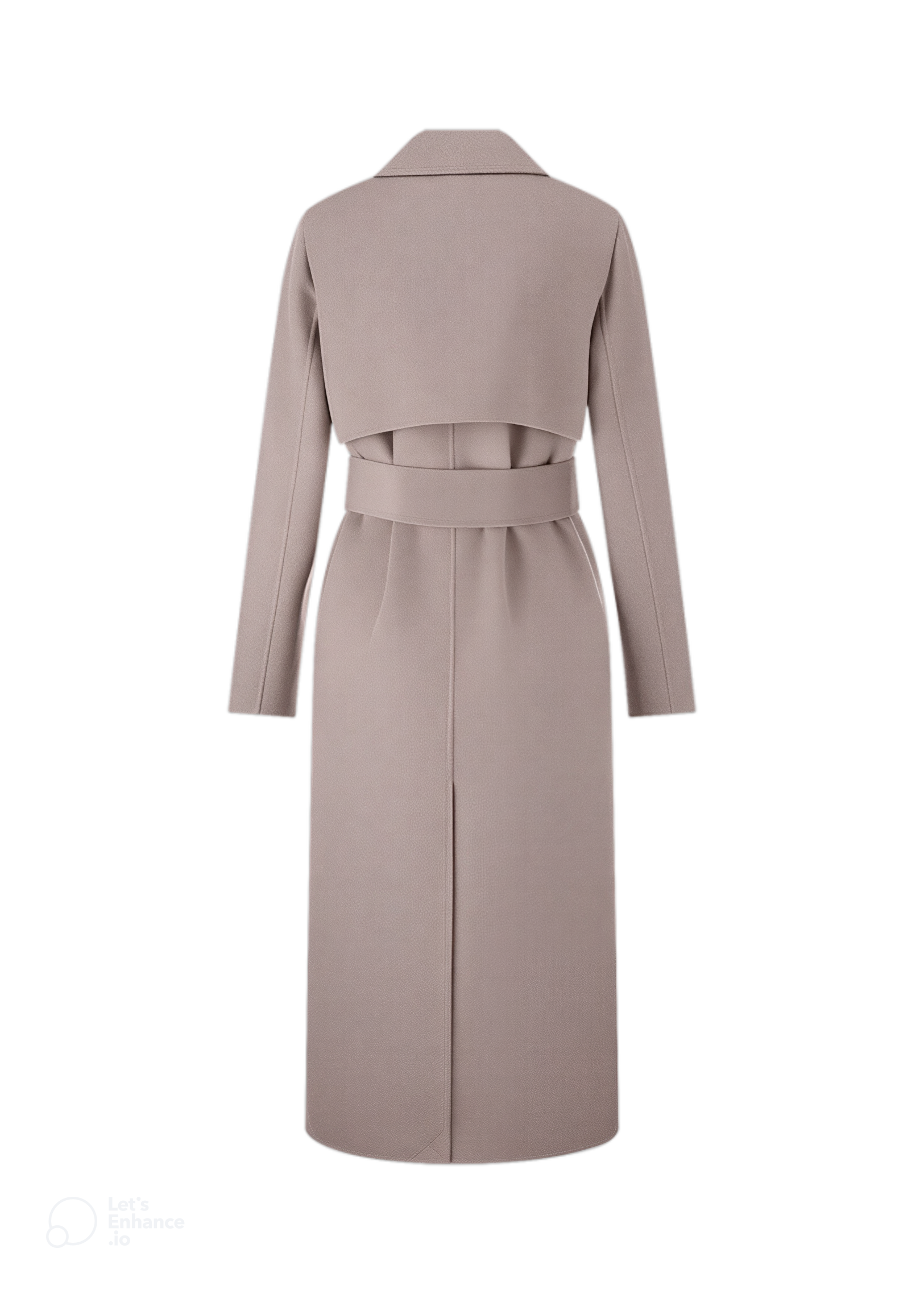 - beżowy płaszcz z paskiem